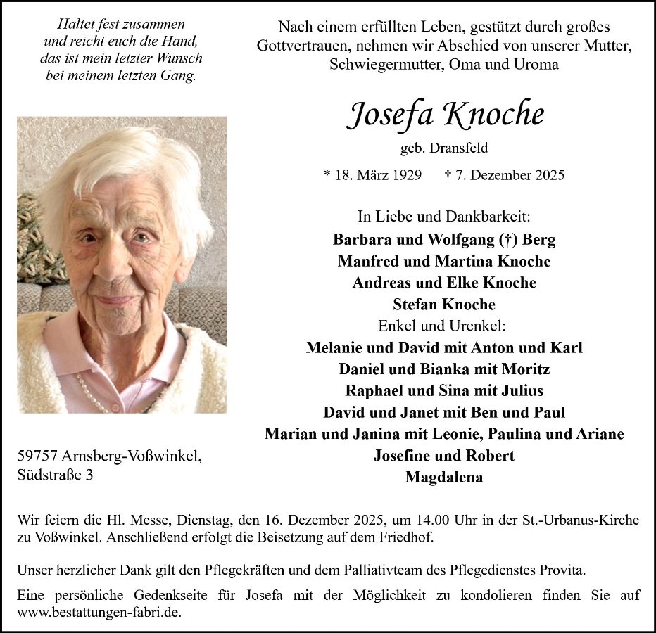 Die Frauen des kfd-Spielekreises der St. Urbanus-Gemeinde möchten euch allen die herzliche Anteilnahme zum Tod eurer Mutter, Großmutter und Urgroßmutter aussprechen.