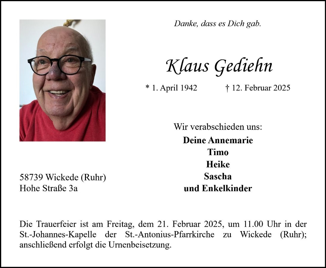 gestorben am 12. Februar 2025 in Arnsberg-Hüsten