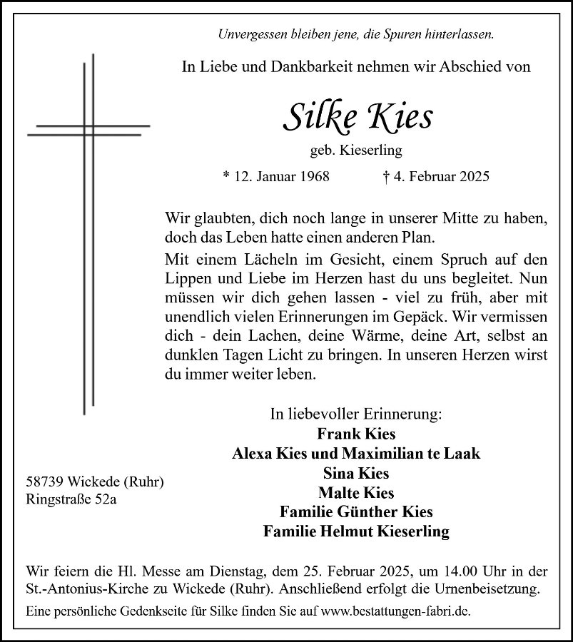 Ich werde Silke als stets freundliche und immer gut gelaunte langjährige Kollegin in guter Erinnerung behalten. Den Angehörigen spreche ich hiermit meine aufrichtige Teilnahme aus und wünsche allen viel Kraft in diesen schweren Stunden.